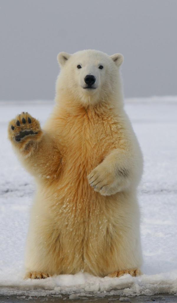 Wallpaper A large polar bear sits in the snow with a raised paw.