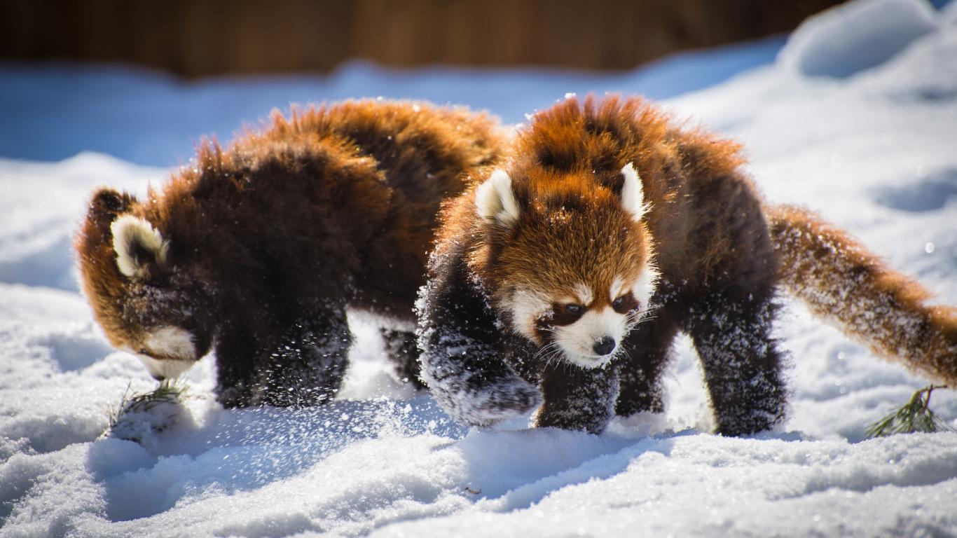 Wallpaper Two funny red pandas playing in the snow
