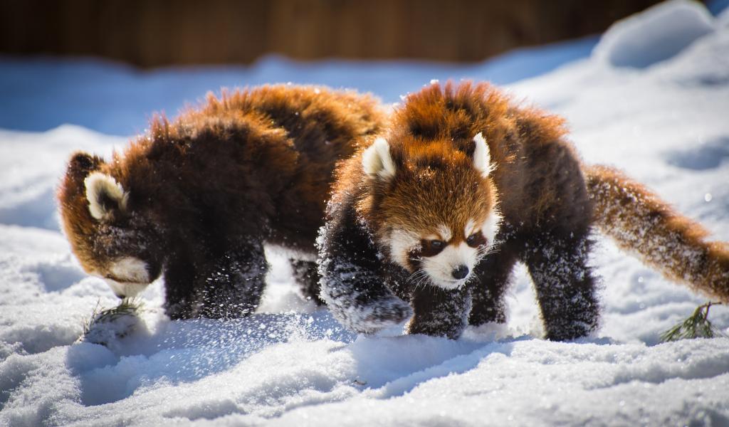 Wallpaper Two funny red pandas playing in the snow