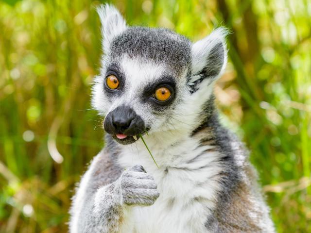 Wallpaper Lemur with yellow eyes eats grass
