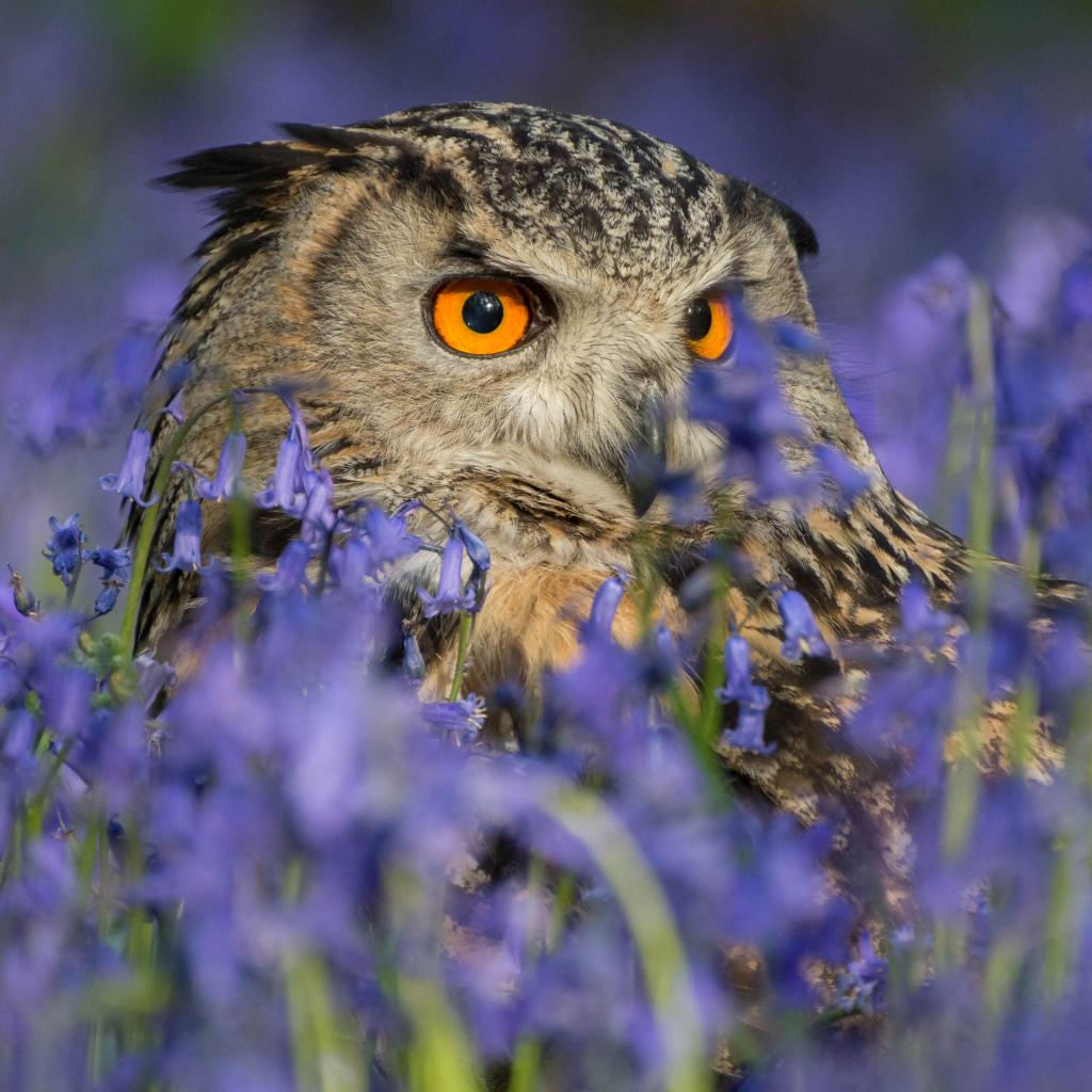 Wallpaper Owl hiding in blue wildflowers