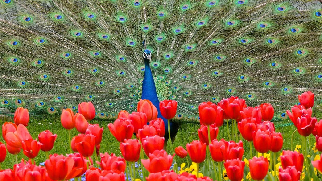 Wallpaper Beautiful peacock on a background of red tulips
