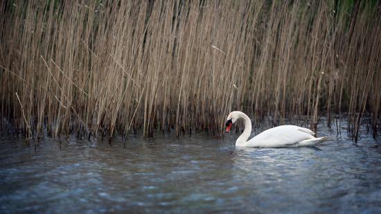 Wallpaper White beautiful swan in the water near a dry cane