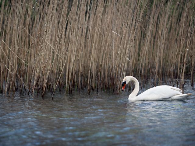 Wallpaper White beautiful swan in the water near a dry cane