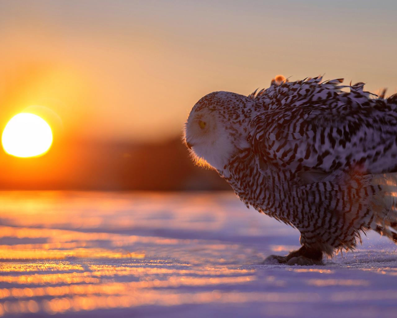 Wallpaper Owl in the snow in the sun at sunset