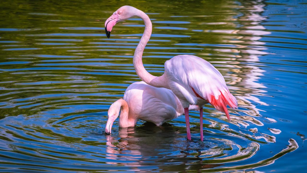 Wallpaper Two pink flamingos bathe in the water