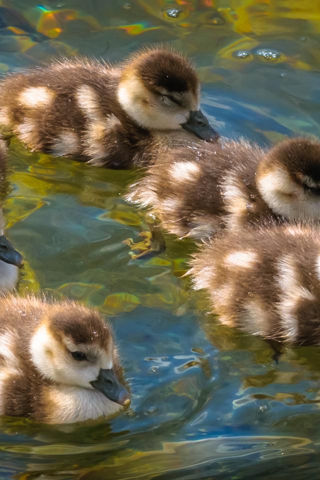 Wallpaper Little ducklings swim across the water