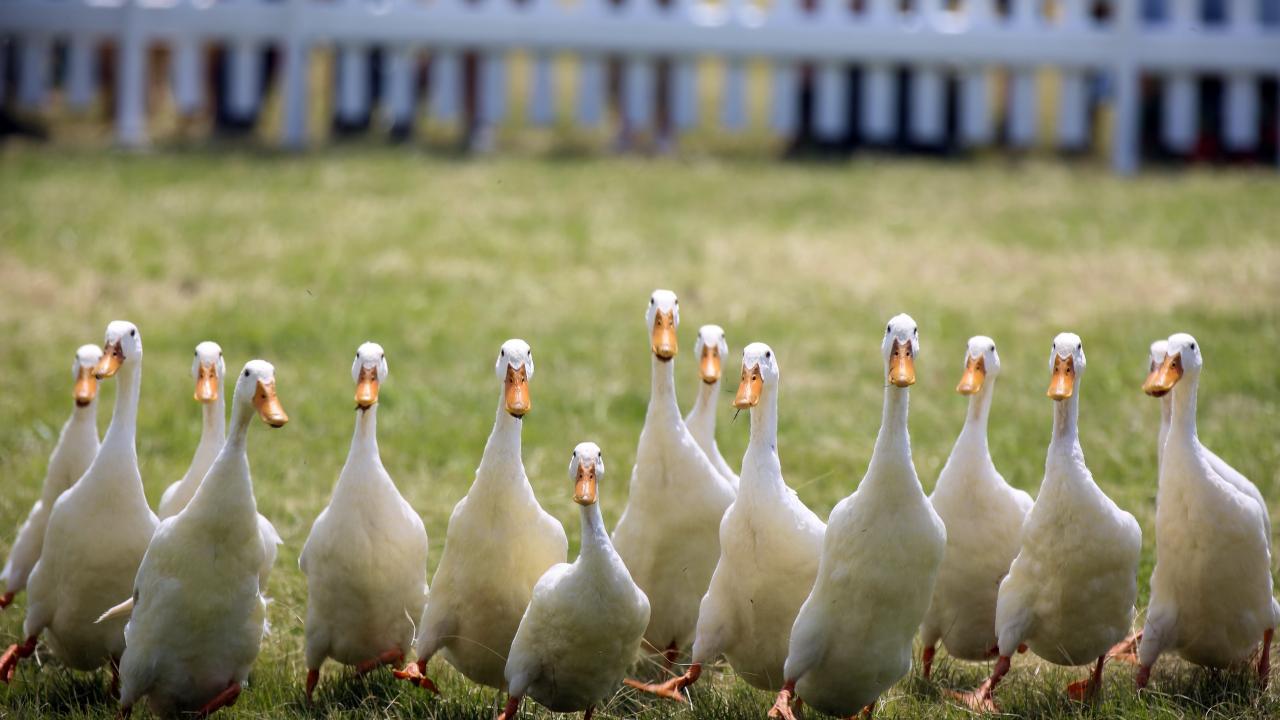 Wallpaper A flock of domestic geese runs along the green grass