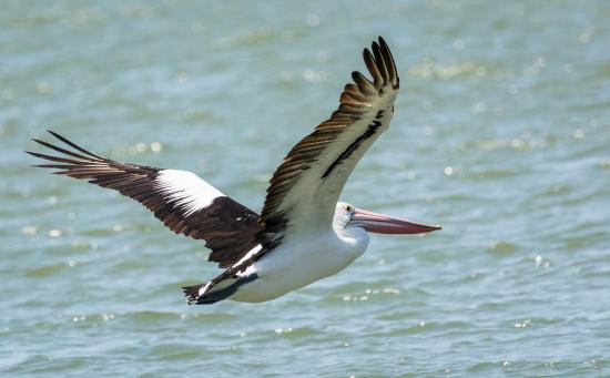 Wallpaper Big bird pelican flies over the water