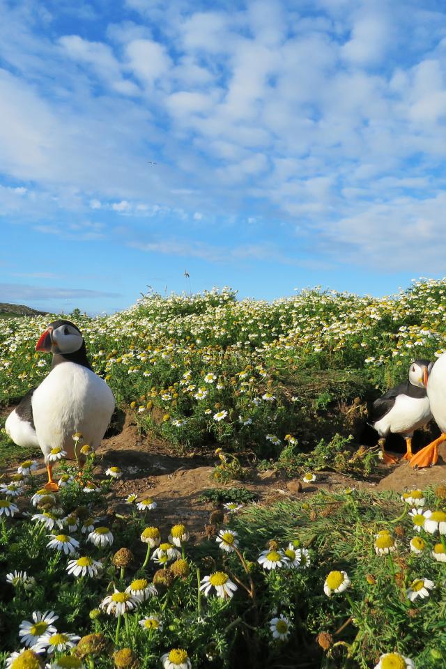 Wallpaper Birds of impasse on a chamomile field under a blue sky