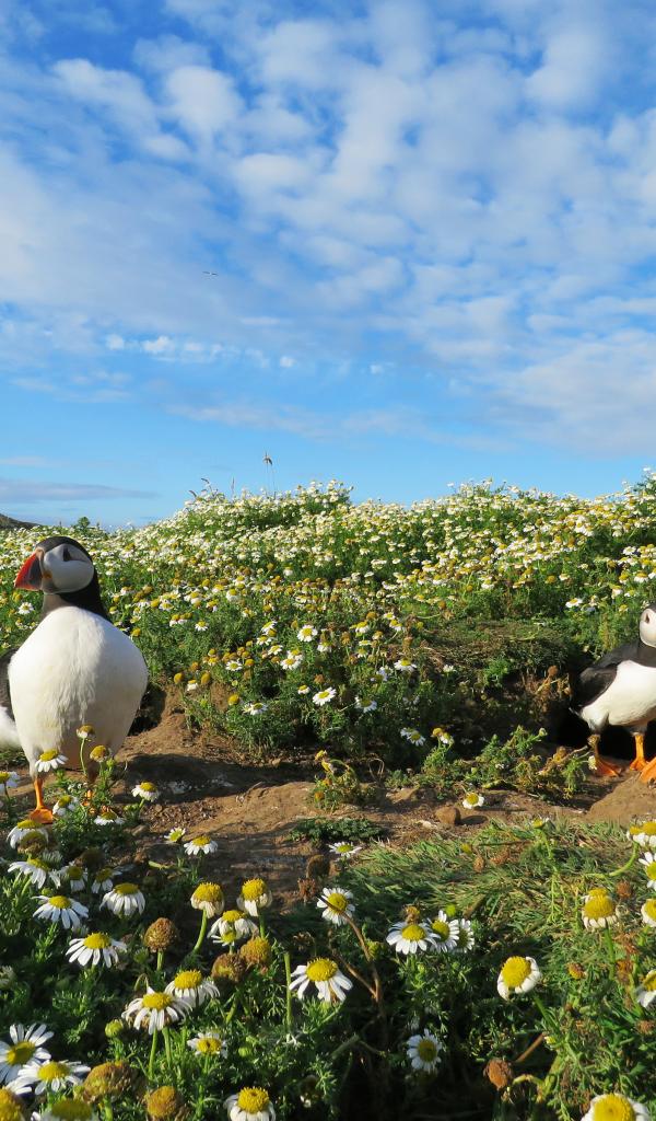 Wallpaper Birds of impasse on a chamomile field under a blue sky