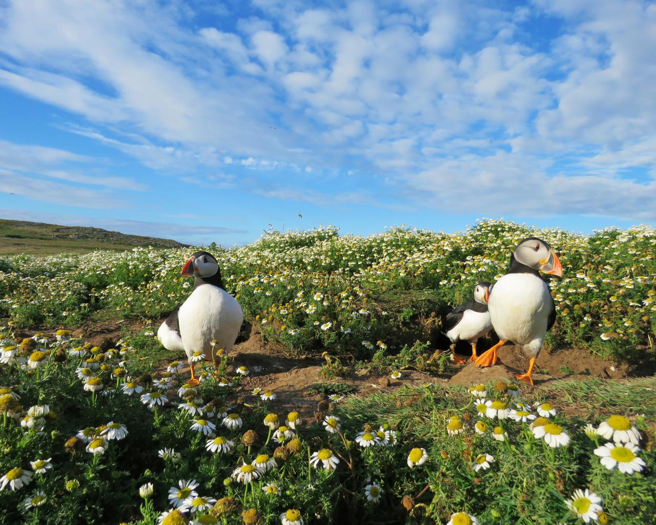 Wallpaper Birds of impasse on a chamomile field under a blue sky