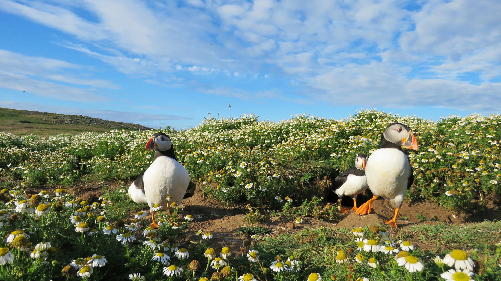 Wallpaper Birds of impasse on a chamomile field under a blue sky
