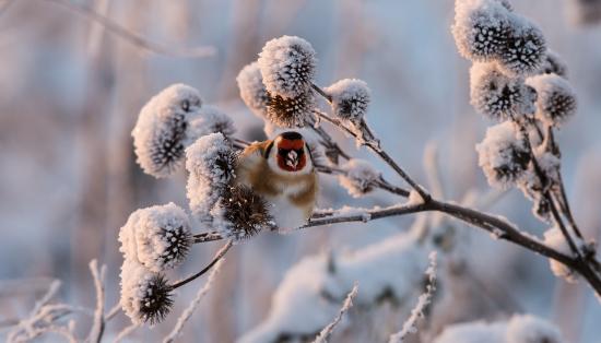 Wallpaper A small bird of a dandy sits on a frost-covered branch