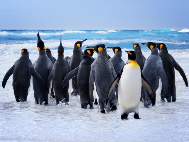 Wallpaper A flock of penguins goes into the ocean water