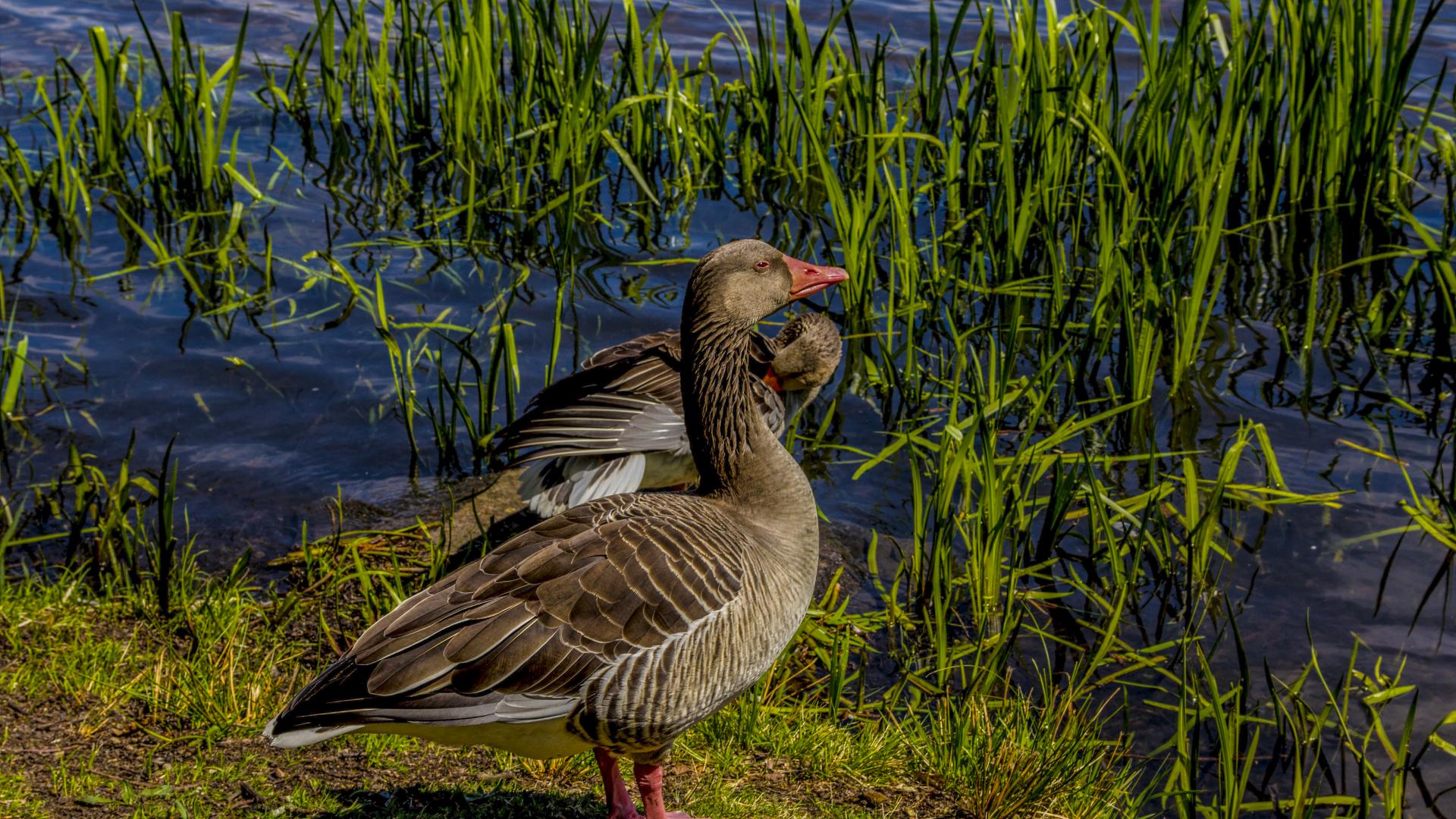 » Wallpaper Two large gray goose by the pond