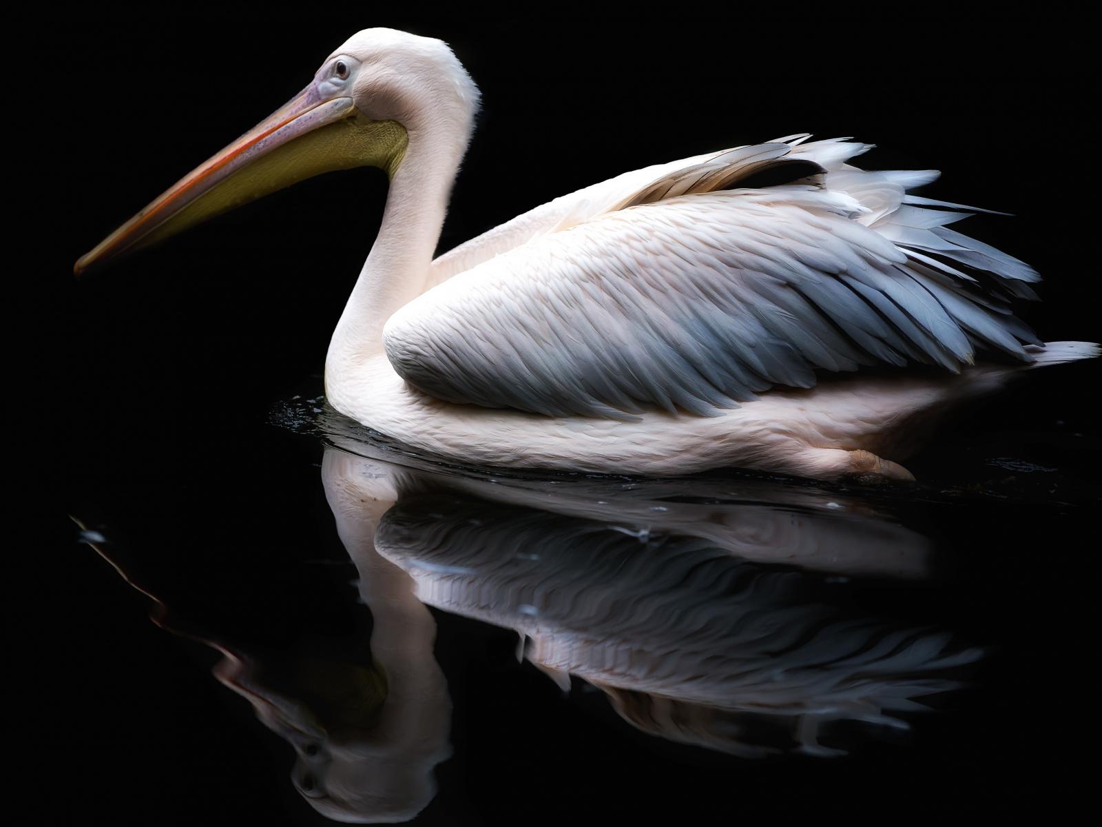 Wallpaper White pelican reflected in water on a black background