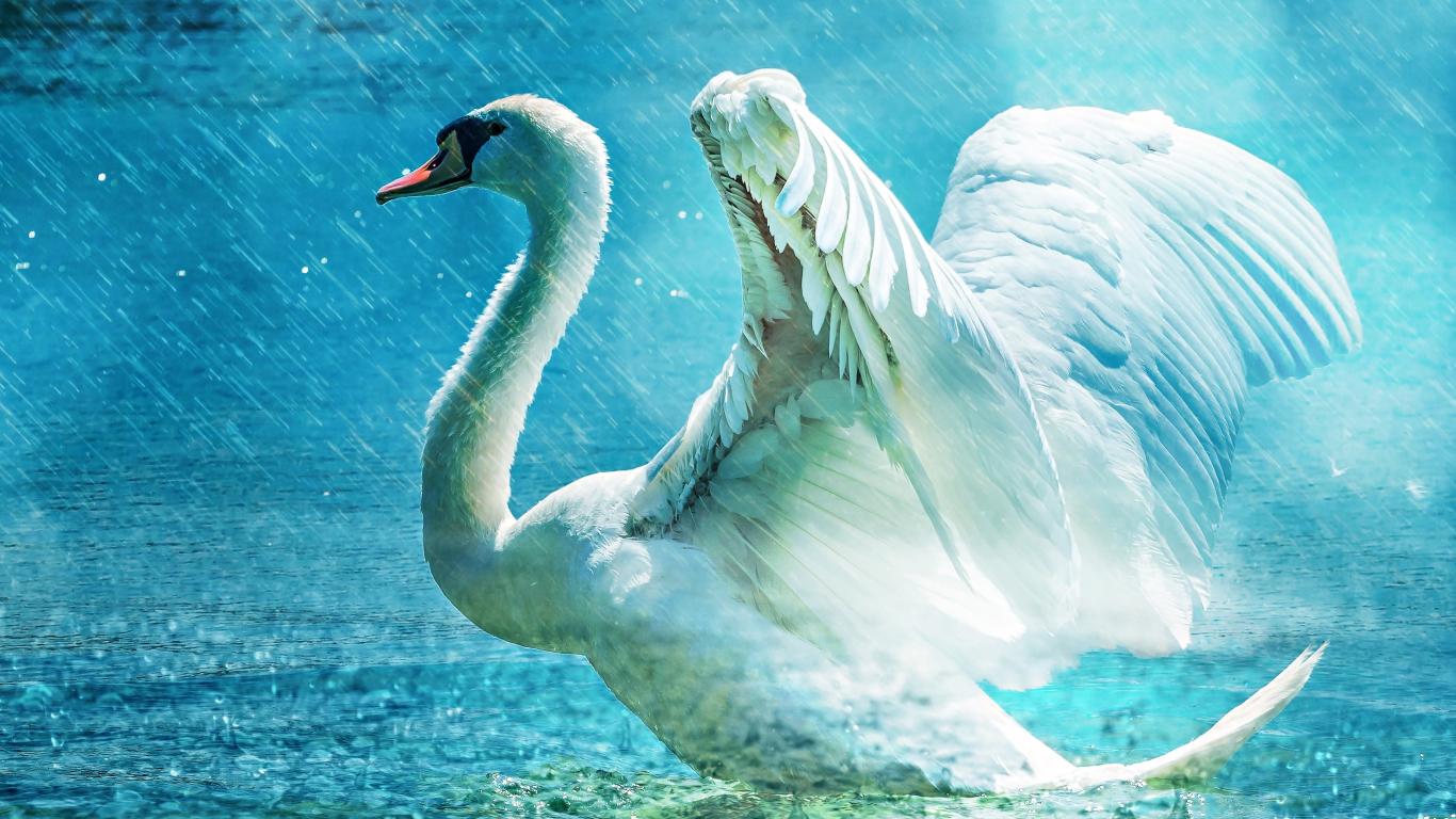 Wallpaper White swan takes off from the lake in the rain