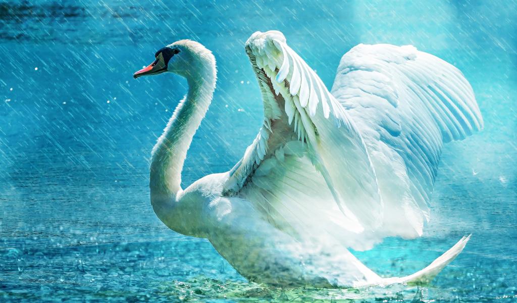 Wallpaper White swan takes off from the lake in the rain