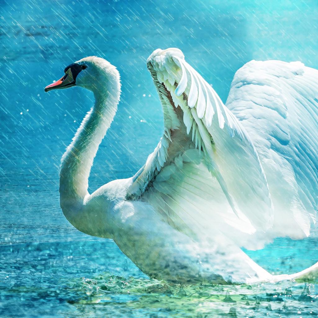 Wallpaper White swan takes off from the lake in the rain