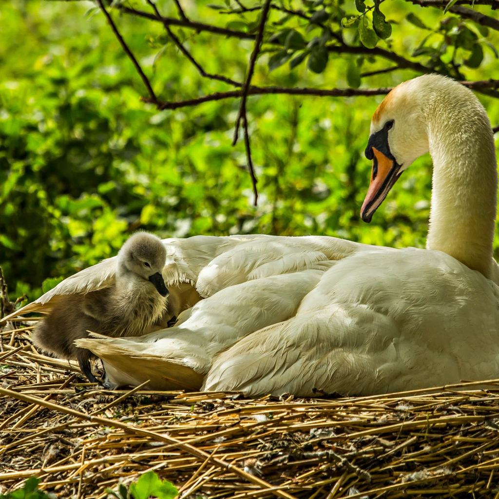 Wallpaper Beautiful white swan with chicks in the nest