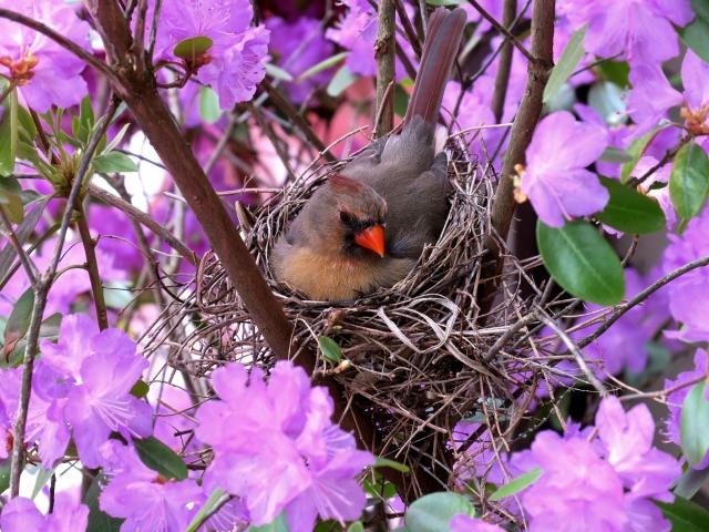 Wallpaper Little bird cardinal in a nest among flowers