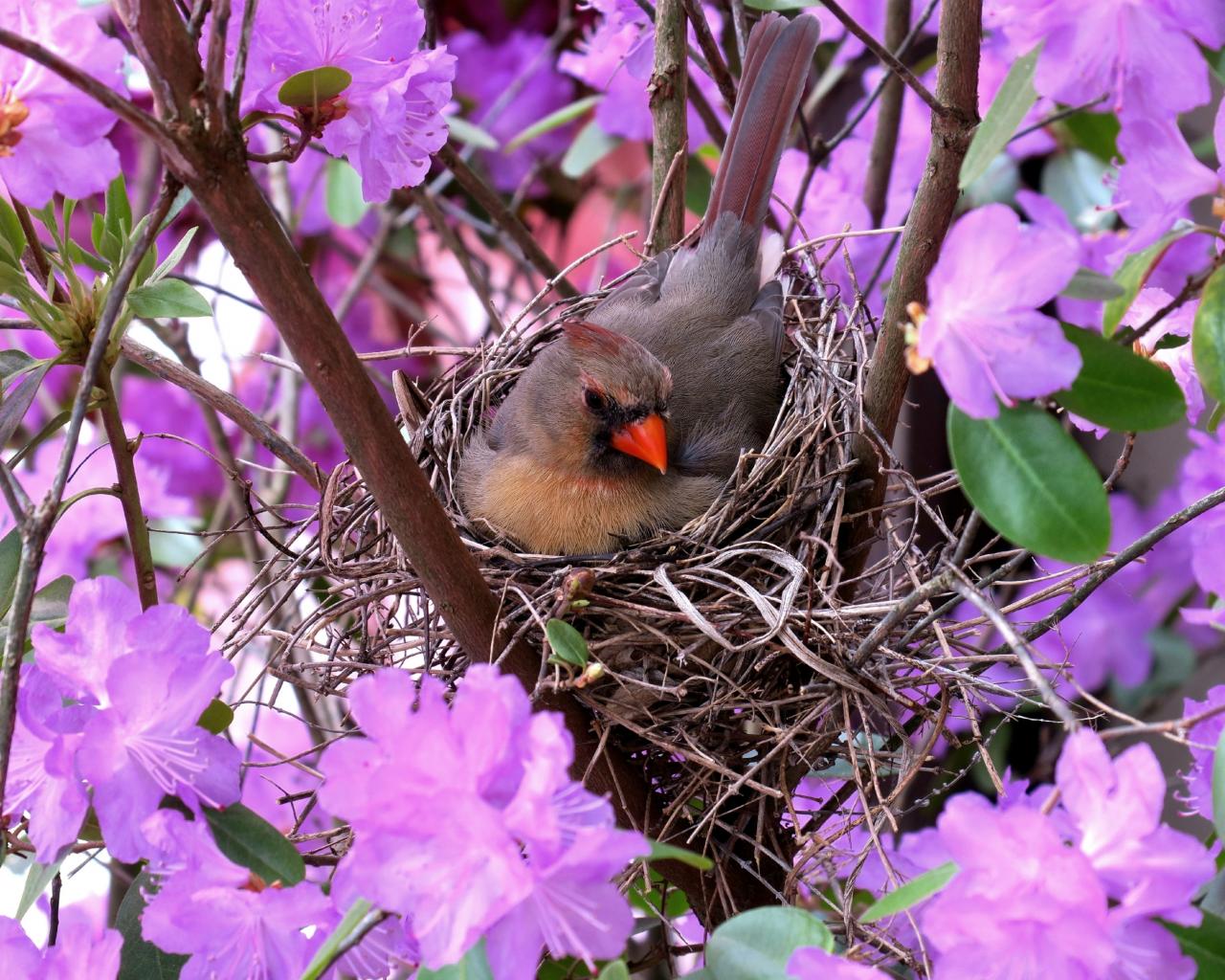 Wallpaper Little bird cardinal in a nest among flowers