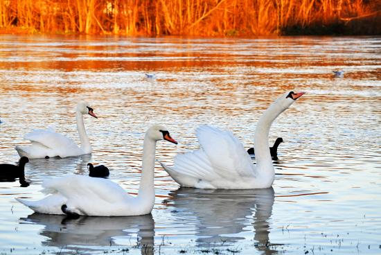 Wallpaper Black swans in a pond against a beautiful green forest, Japan