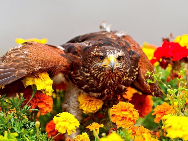Wallpaper The predatory hawk sits on flowers