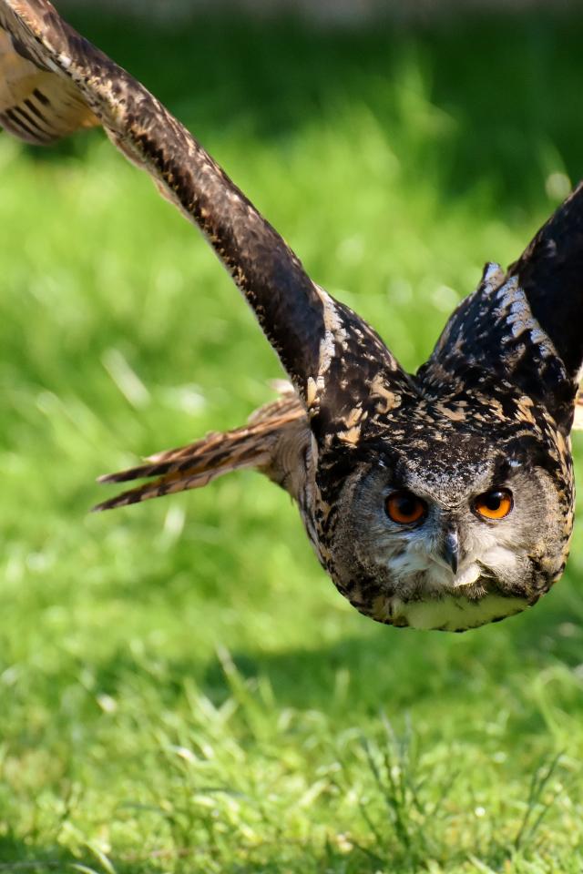 Wallpaper The flight of a large owl over the green grass