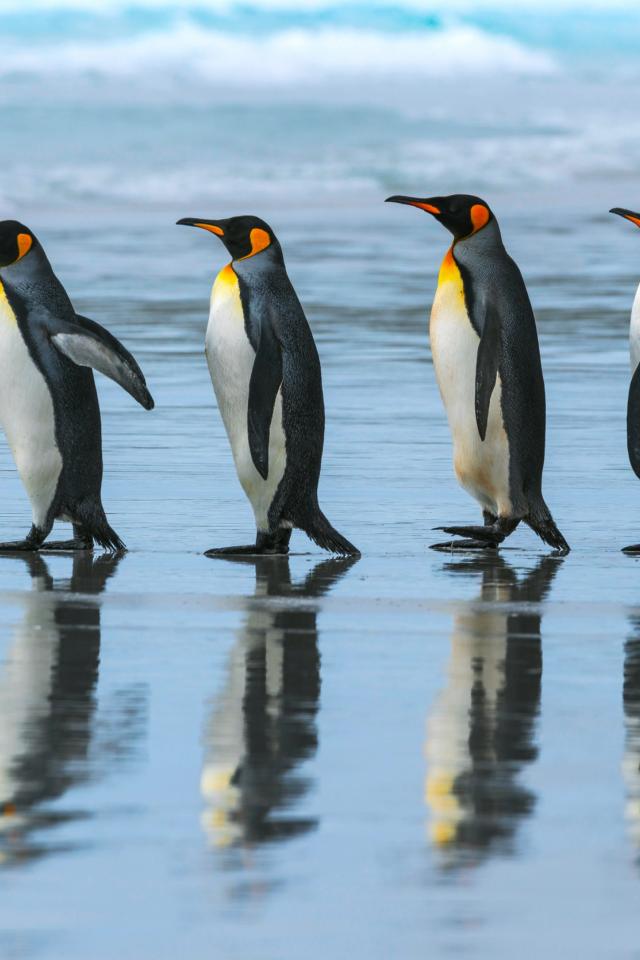 Wallpaper Five penguins are on the water