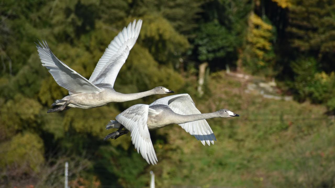 Wallpaper Two gray geese fly over the lake