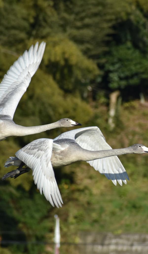 Wallpaper Two gray geese fly over the lake