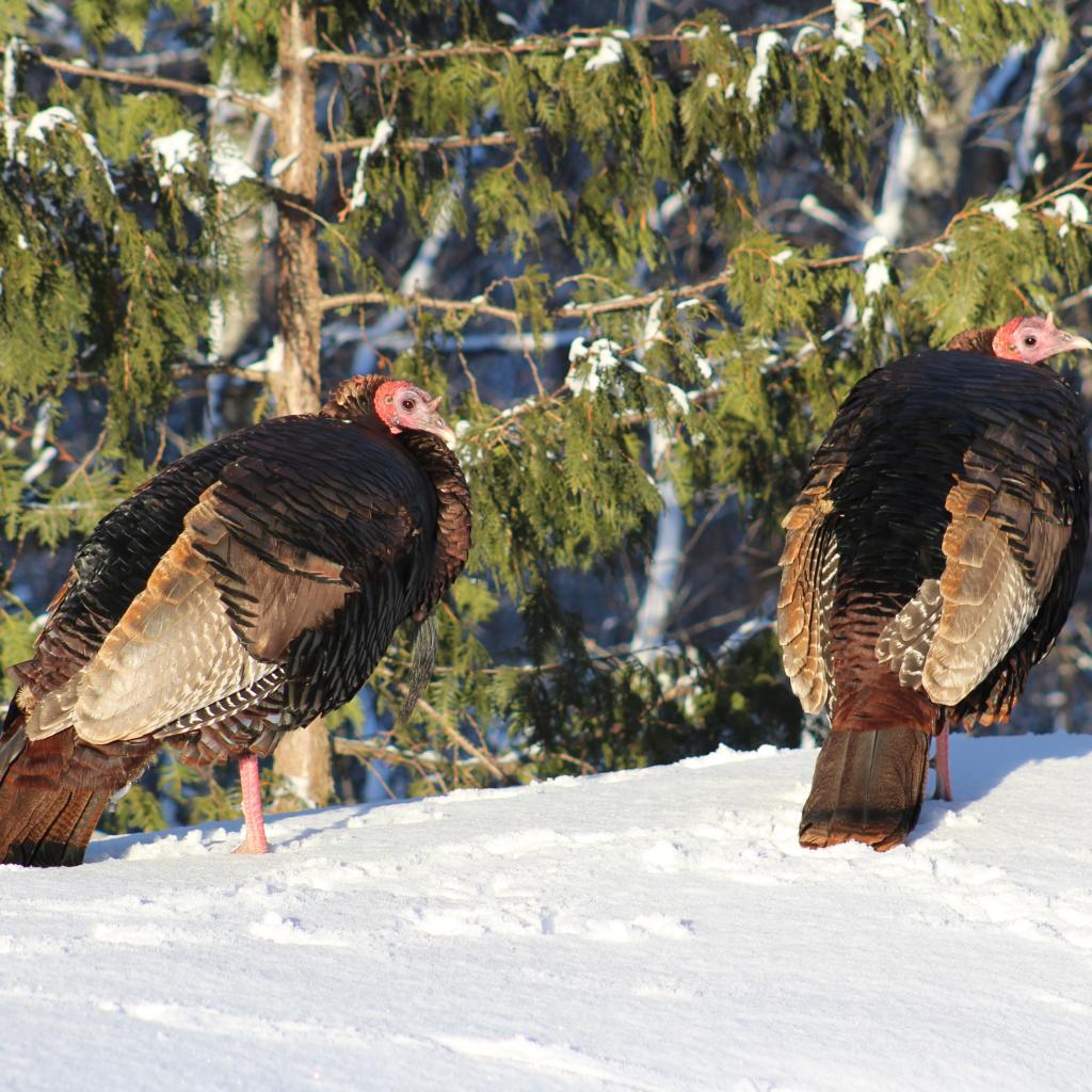 Wallpaper Two wild turkeys in the snow in the forest