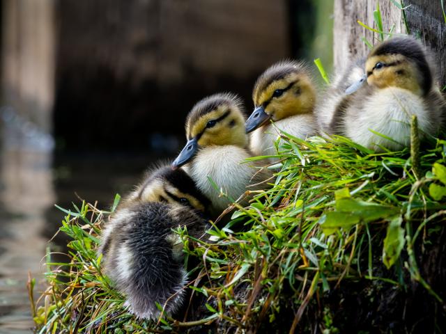 Wallpaper Little ducklings sit on the grass by the pond