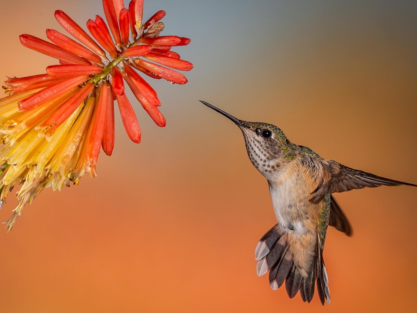 Wallpaper Hummingbird bird in flight at a red flower