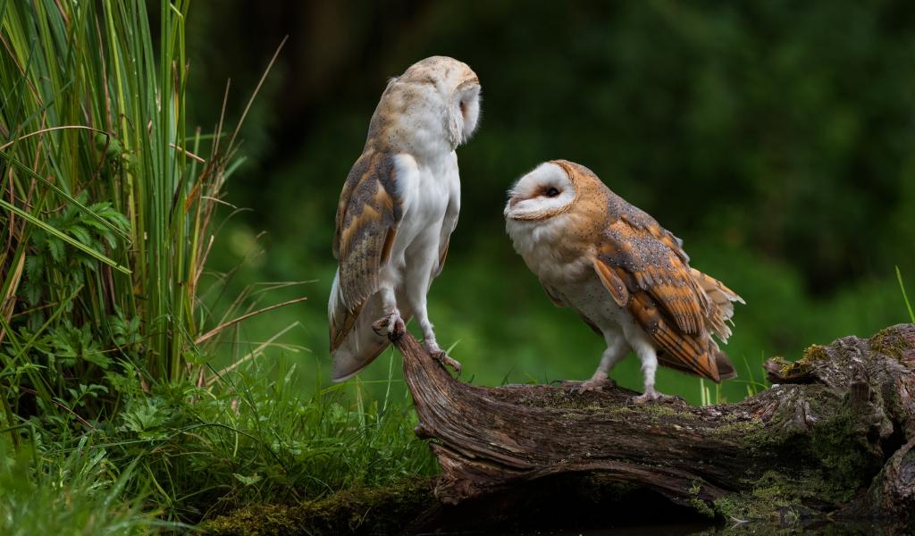 Wallpaper Two owls sit on a dry tree near the water
