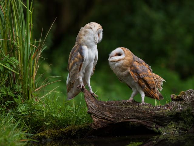 Wallpaper Two owls sit on a dry tree near the water