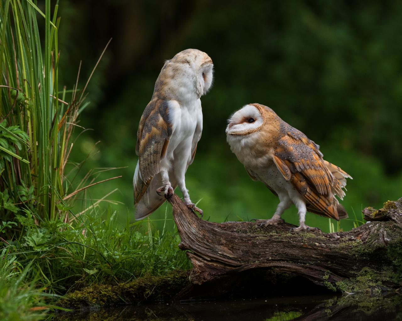 Wallpaper Two owls sit on a dry tree near the water