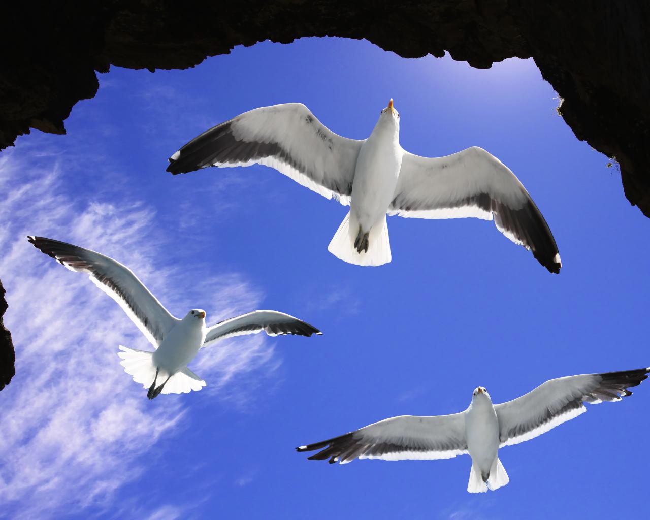 Wallpaper Three white seagulls in the blue sky