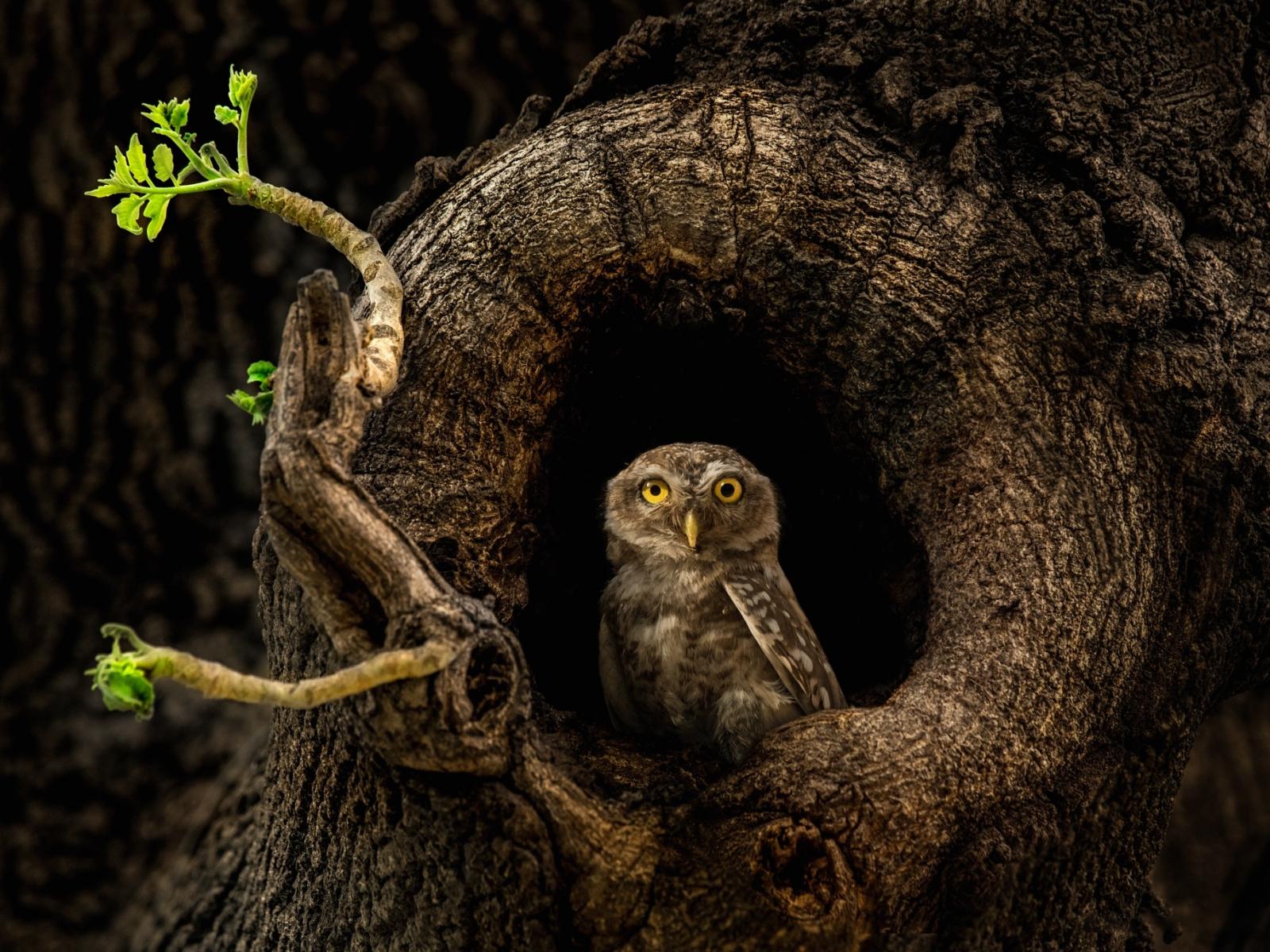 Wallpaper Owl with yellow eyes sitting in a hollow