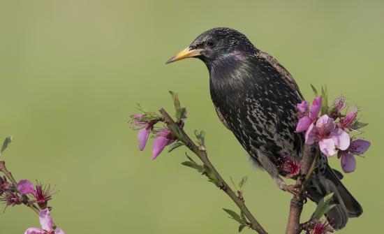 Wallpaper Common black starling sits on a branch with flowers
