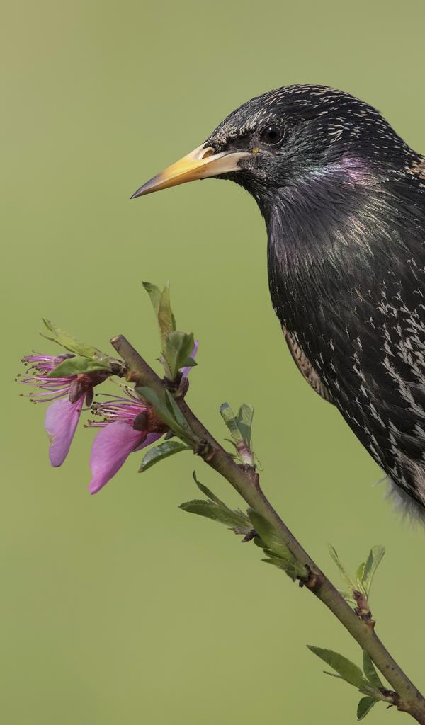 Wallpaper Common black starling sits on a branch with flowers