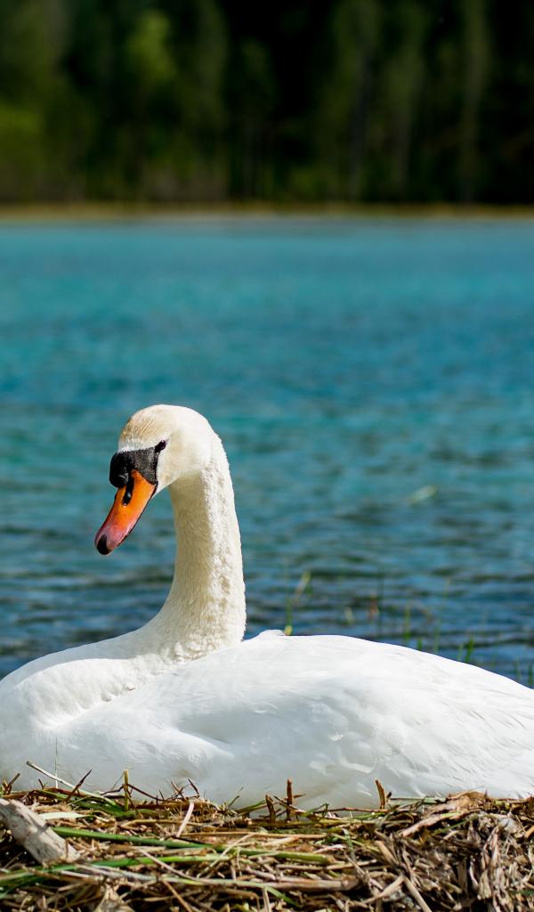 Wallpaper Beautiful white swan in a nest by the lake