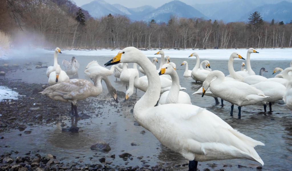 Wallpaper Beautiful white swans in a winter lake in the mountains