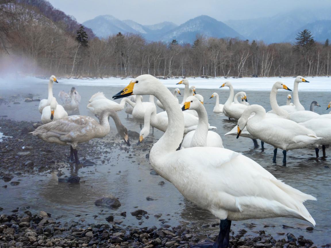 Wallpaper Beautiful white swans in a winter lake in the mountains