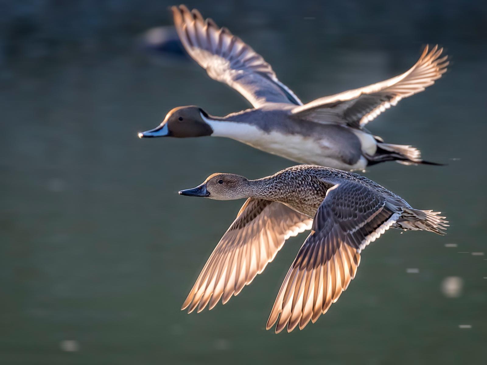 Wallpaper Two wild gray ducks fly over the lake