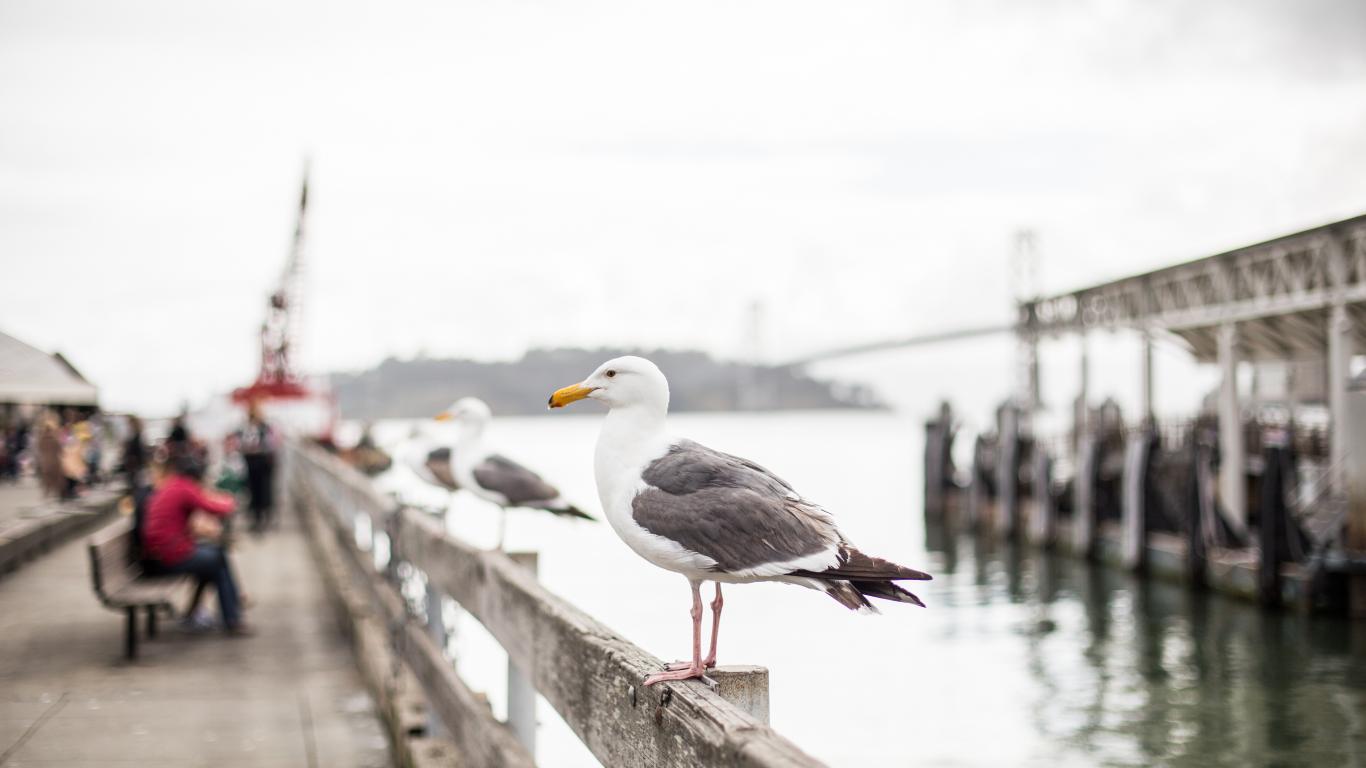 Wallpaper A large sea gull sits in a railing by the sea