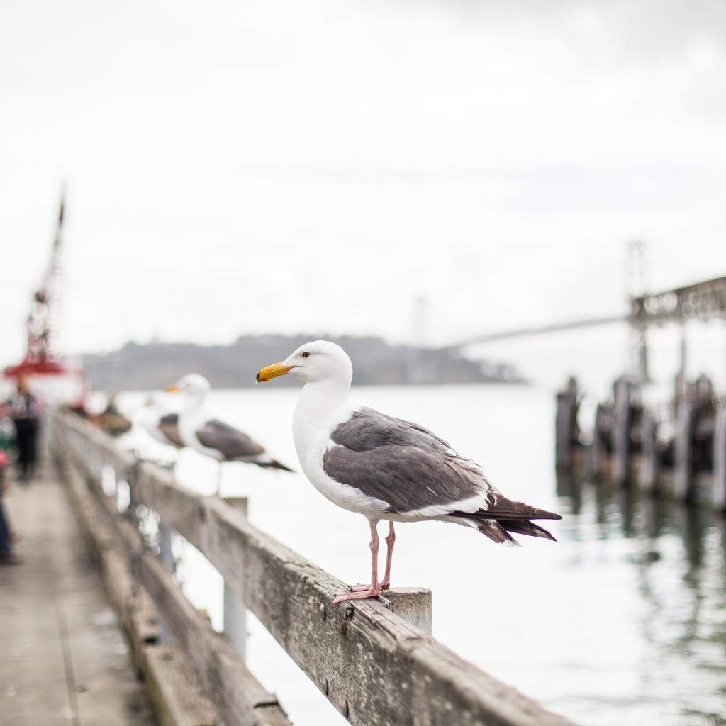 Wallpaper A large sea gull sits in a railing by the sea