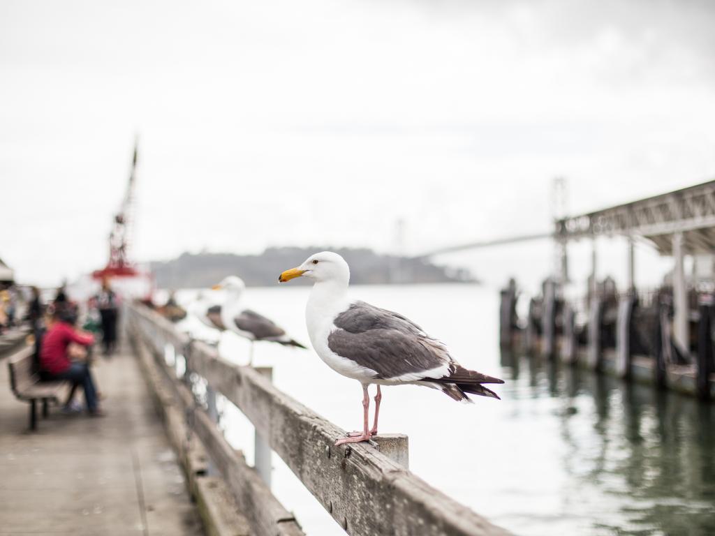 Wallpaper A large sea gull sits in a railing by the sea